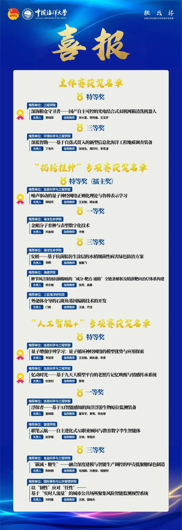 在本届赛事主体赛中,工程学院《深海粮仓守卫者——国产自主可控的光电结合式双机网箱清洗机器人》项目获特等奖;在“揭榜挂帅”专项赛中,信息科学与工程学部《噪声驱动的量子神经网络正则化理论与鲁棒表示学习》项目以特等奖排名第一身份斩获擂主奖;在“人工智能+”专项赛中,信息科学与工程学部《量子增强序列学习:量子循环神经网络的模型优势与应用探索》项目获挑战赛特等奖、《忆动时光-基于九天大模型平台的老照片记忆唤醒与情感传承系统》项目获创意赛特等奖。